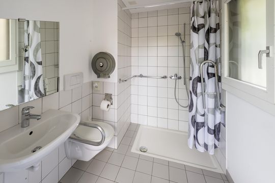 Das Gruppenhaus verfügt über vier 8er-Zimmer und ein 2er-Zimmer mit einem breiten Fenster auf die Spielwiese. Zudem steht ein grosszügiger Aufenthalts-/Essraum, sowie eine gut ausgestattete Küche wahlweise zur Verfügung. Das Haus ist überall rollstuhlgängig und hat ein eigenes WC für invalide Besucher (beim Gruppenhaus). Die Sanitäranlagen (WC, Duschen) befinden sich im Hauptgebäude und im separaten Sanitärgebäude.